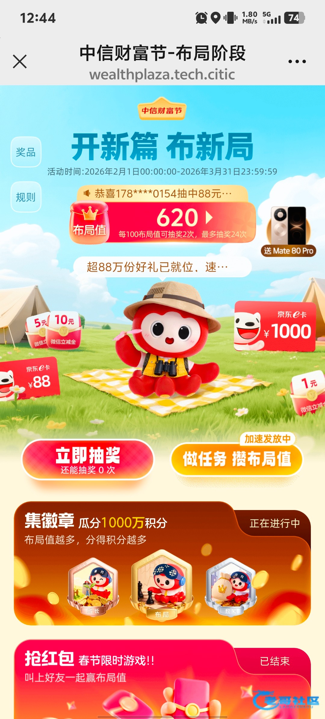 微信搜索中信财富广场 然后点那个兑换立减金的活动,进去浏览点任务,然后抽奖