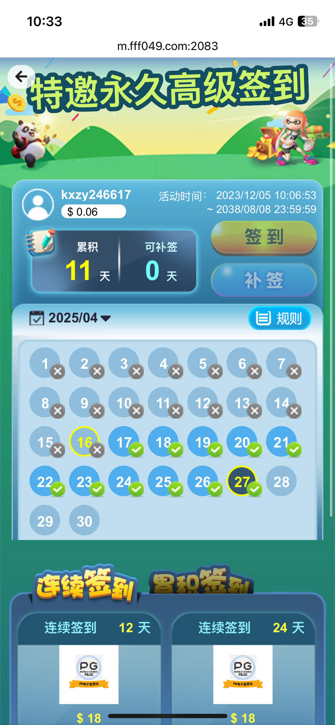 去年到今年的3月份一直签到,充了15万,看公告写永久,现在都不给我签了